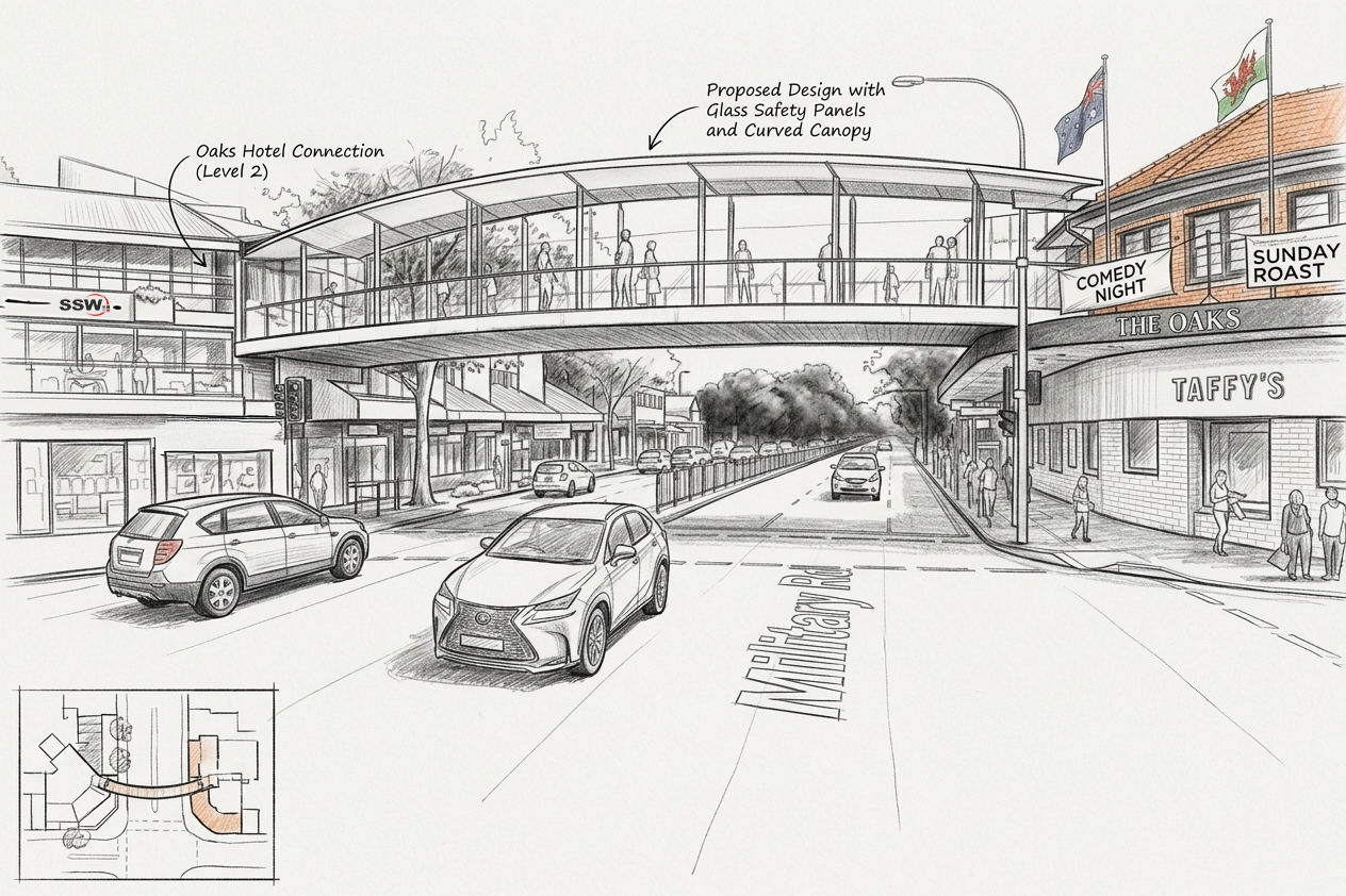 The 40-metre elevated structure will connect the southern commercial precinct (including AI software firm SSW) directly to the historic Oaks Hotel site, effectively creating a dedicated safety corridor for commuters and local workers.